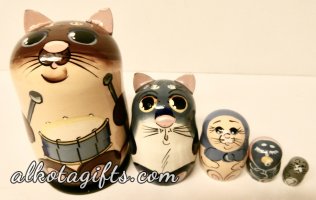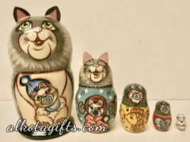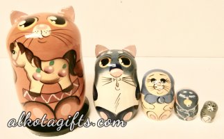 Nesting dolls with images of different animals on them are very popular and highly collectible. Majority of the nesting dolls carry images of cats: girls with cats, girls with cats in the basket are the most popular ones. Village girls are decorated with bright shawls and traditional clothes. Some dolls depict Ruissin people playing musical instruments and cats are close by. People of all ages love animals, are fond of nature. While browsing this collection you can enjoy short videos of some of the beloved animals which fascinate us all every time we see them - giraffes, rhinos, lions, snakes, frogs... With these clips we want you to pay attention to the high level of similarity of our product to the real animals. We thank Russian artists for that and hope that you will love and buy these funny nesting dolls - authentic, original, painted by hand and imported from Russia! If we do not have what you need we can make it for you!