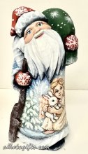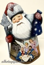 Ded Moroz's popularity on the one hand, and religious beliefs of Russian people made it possible and then common to paint Nativity scenes as well as Guardian angels on the front and back of Russian Santas' carvings. The variety and intricacy of carvings are very vast. The quality of painting is different. There is an alarming trend today - painters are leaving this field. As a result the price of professional work - paintings of Nativity scenes on wood - goes up. Russians believe in Guardian angels. Russian Orthodox Church teaches that every person in birth acquires a Guardian angel (angel-guardian, as Russians call it) who accompanies him through life. That is why carvings of Russian Santas with guardian angels are very well accepted and are of high collectible value for Russian people.