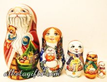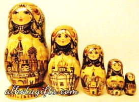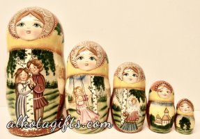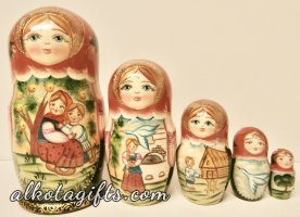 Russian nesting doll or "Matryoshka" doll, was called after a woman' s name "Matryona", which was very popular in Russia in 18th-19th centuries. One of the major reasons of its popularity was the root Matra in the word, which in old Russian means "Gender". After the nesting doll appeared as a toy it was dedicated to Matryona, who quickly began symbolizing Russian Woman, who worked hard in the household, catering the children and guests. Russian Matryoshka nesting doll soon became also a symbol of Russian family, Russian village, Russian Land.