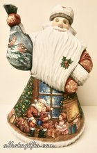 According to old folkloric tradition Russian Santa - Grandfather Frost - bring presents to the good behaved children and actively participates in Christmas and New Year's Eve celebrations. Russians love to get presents from Russian Santa - Ded Moroz. That is why they call him kindly Dedushka Moroz, using the diminutive form of the word ded (old Man). Russian Ded Moroz usually appears in traditional red long heel length gown decorated in flowers, sometimes furs, wearing a fur hat and walking with a long and big staff. Russian Santa is accompanied by his granddaughter Snegurochka, who wears blue and silver robes with sometimes a crown shaped kokoshnik (head-dress) on her head. It is a tradition to paint children and families on carvings. In Moscow and Sergiyev Posad, main centers for wooden craft, there are several artists who specialize in painting children on Santa carvings. Usually these works are one-of a- kind and of high value. These artists are scarce and the their painting professionalism is high. It is really difficult to paint in watercolor on the round wooden surface of the carving.