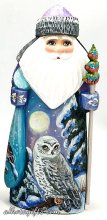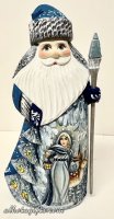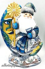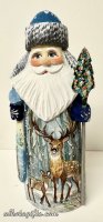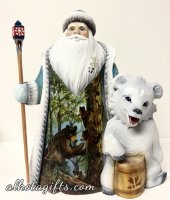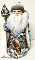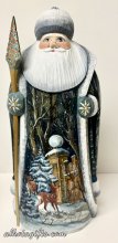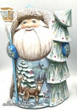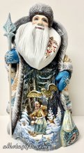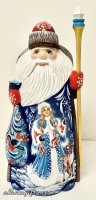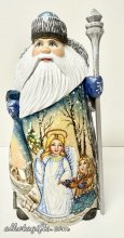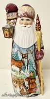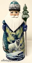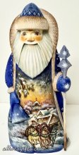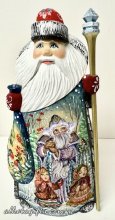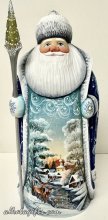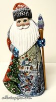 Russian Santas' popularity explains a vast variety of Russian Santas figurines. One of the most popular and beloved styles is Santa with decorated with landscape subject matter- intricately painted by hand on the body of Santa Claus. Initially the artists painted scenes on the back of the figurine. Later they switched to the front. The most expensive carvings have pictures painted on the front and the back and therefore are considered valuable. An artists painting such a carving could spend months on one figurine. The carver "waits up to five years to let the log dry before he carves. So, there are many justifications for high price and value!