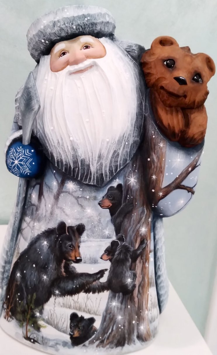 This Russian genuine Santa is uniquely handcrafted in Moscow, Russia: carved out of linden wood and painted with acrylic. Workshop "Russkiy Dom", Moscow, Russia.