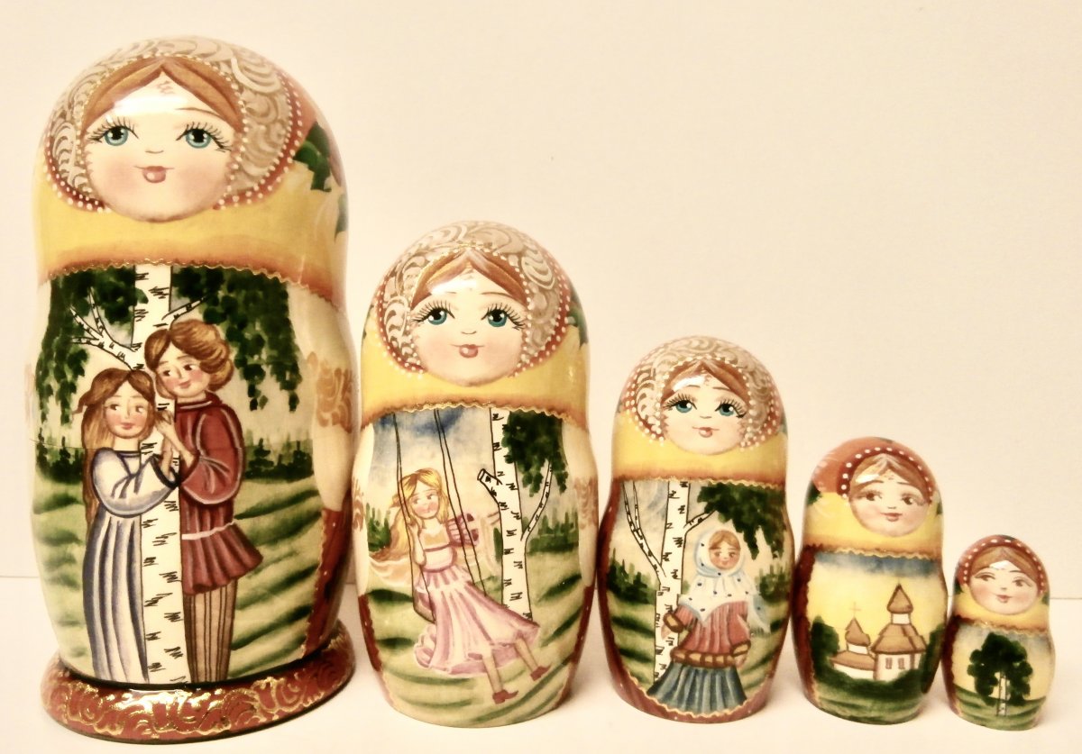 This nesting doll is handcrafted in Moscow, Russia: made out of linden wood and painted with acrylic. Workshop "Russkiy Dom", Moscow, Russia.