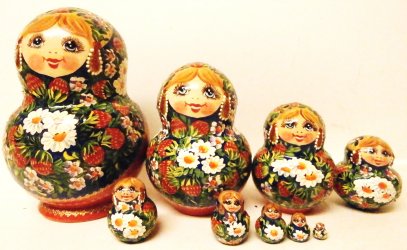 This nesting doll is handcrafted in Moscow, Russia: made out of linden wood and painted with acrylic. Workshop "Russkiy Dom", Moscow, Russia.