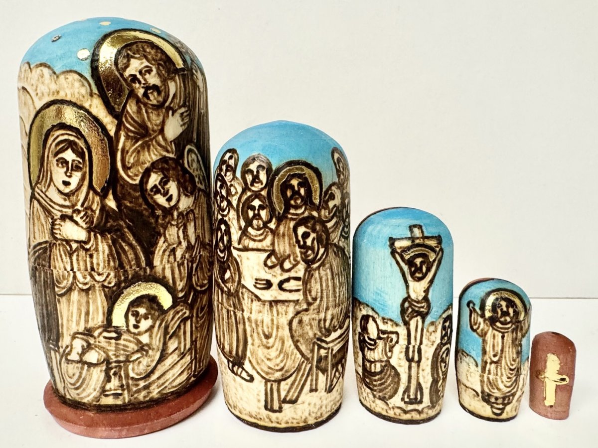 This nesting doll is crafted by hand: made out of linden wood, burned on wood and painted with acrylic. 5.5"H.