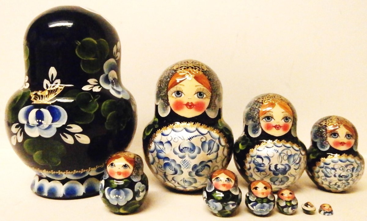 This nesting doll is handcrafted in Moscow, Russia: made out of linden wood and painted with acrylic. Assorted colors. Workshop "Russkiy Dom", Moscow, Russia.
