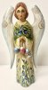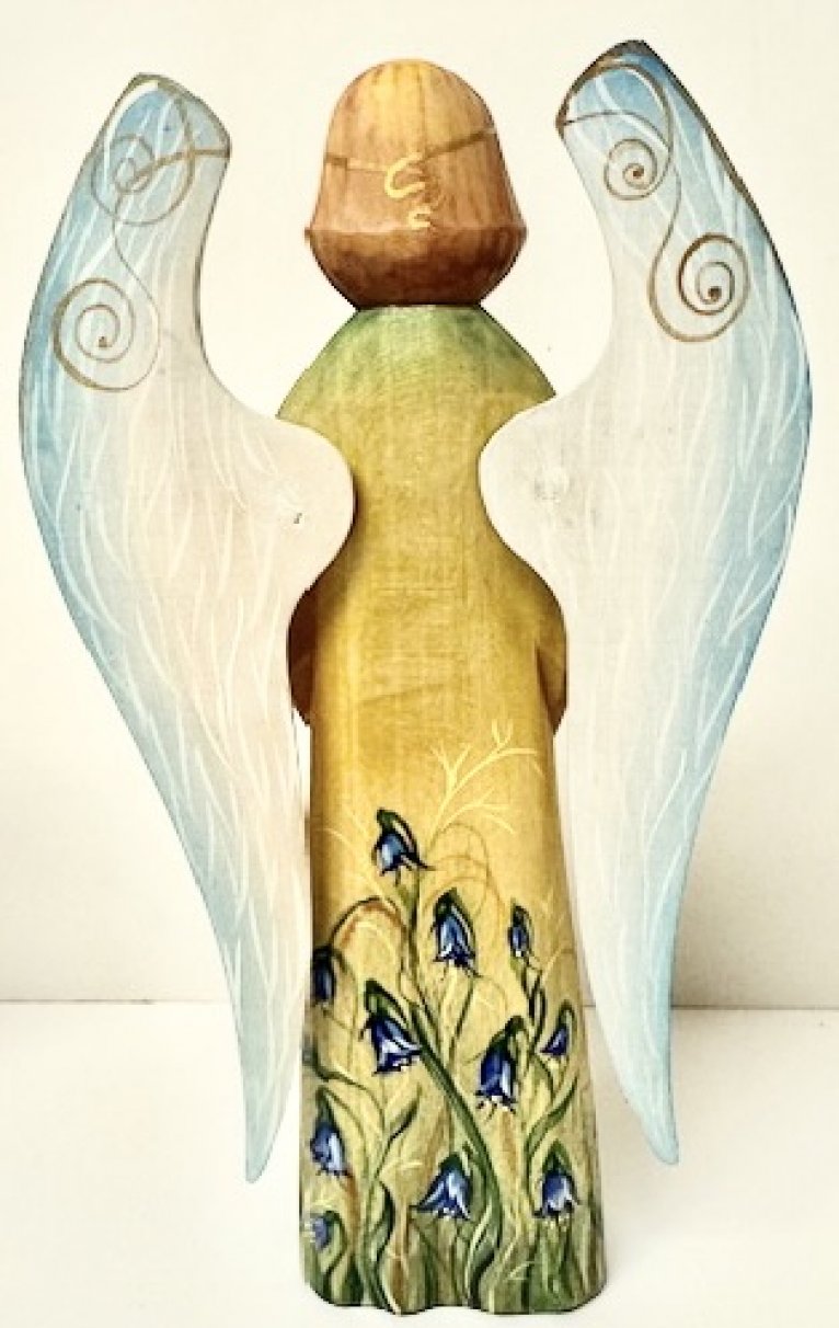 This wooden angel figurine is handcrafted in Moscow, Russia: carved out of linden wood and painted with acrylic. 9"H, unique.