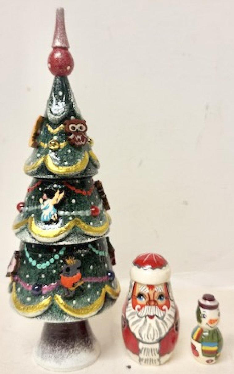 This wooden nesting doll is handcrafted in Moscow, Russia: made out of linden wood and painted with acrylic. Every single Christmas ornament is individually carved and painted and glued to the tree.