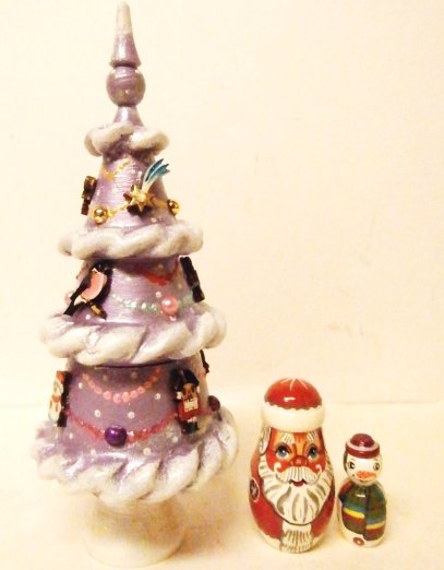 This wooden nesting doll is handcrafted in Moscow, Russia: made out of linden wood and painted with acrylic. Every single Christmas ornament is individually carved and painted and glued to the tree.
