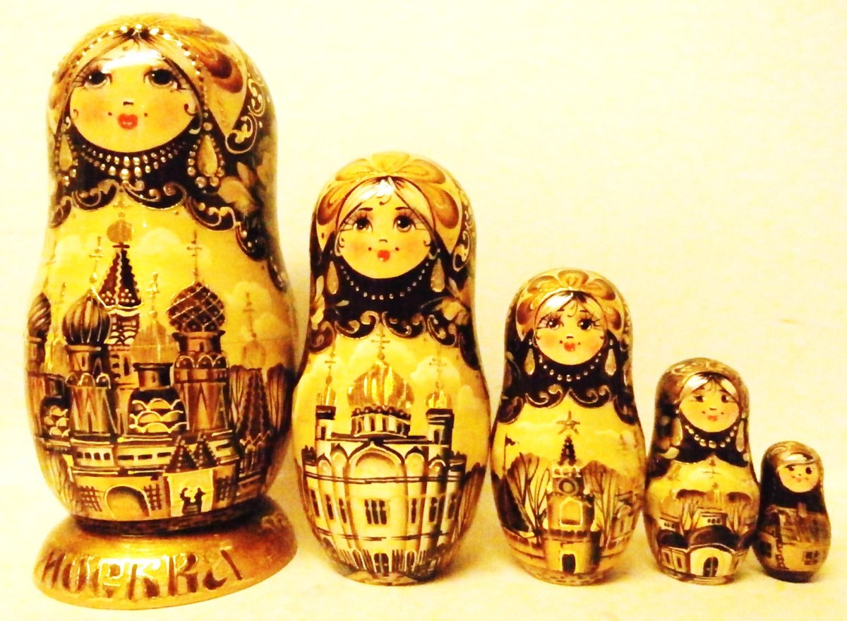 This Russian nesting doll is handcrafted in Moscow: made out of linden wood and painted with acrylic. Limited, Fine quality. Workshop "Russkiy Dom", Moscow, Russia.