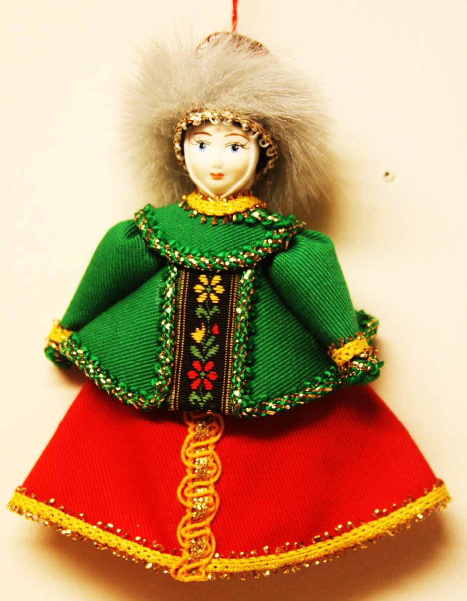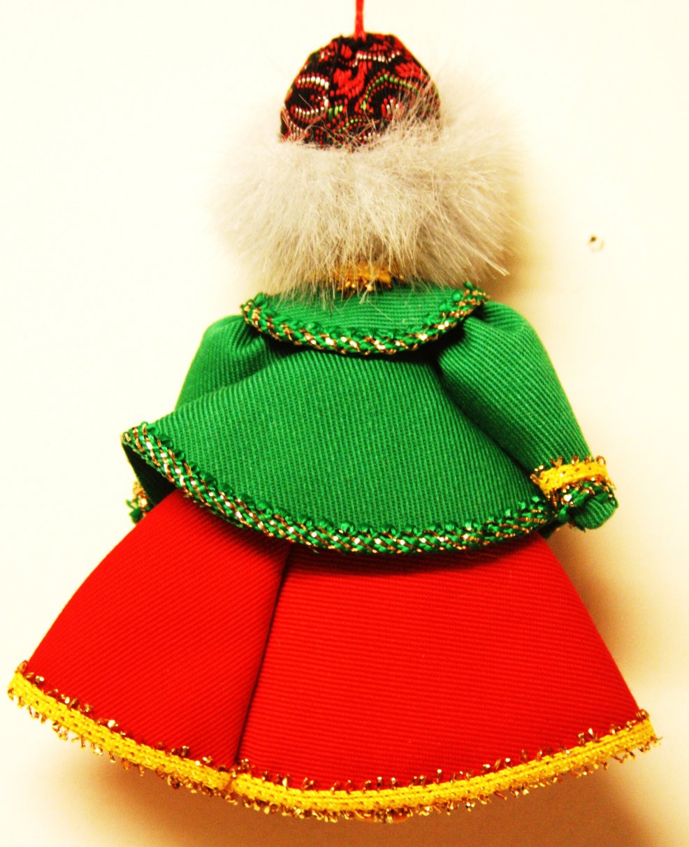 This Christmas ornament is crafted by hand out of fabric with porcelian face. Workshop "Valya".
