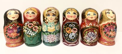 This nesting doll is handcrafted in Moscow, Russia: made out of linden wood and painted with acrylic. Workshop "Russkiy Dom", Moscow, Russia.