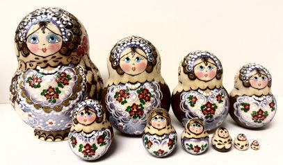This nesting doll is crafted by hand in Russia: made out of linden wood and painted with acrylic. Workshop "Kvitok". Different shawls's color available.