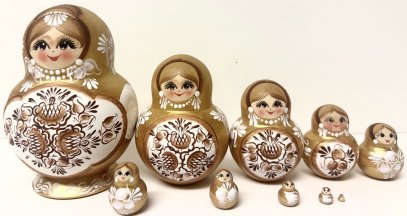 This nesting doll is crafted by hand in Russia: made out of linden wood and painted with acrylic. Workshop "Kvitok". Different shawls's color available.