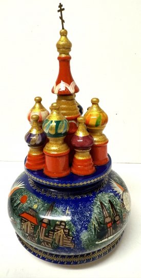 This music box is handcrafted in Moscow, Russia: made out of linden wood and painted with acrylic. It plays the tune "Moscow Nights".