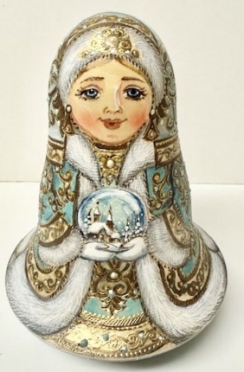 This doll with bell inside is handcrafted in Moscow, Russia: made out of linden wood and painted with acrylic. The subject matter is burned on wood. Authentic gold leaf is appllied. Workshop "Russkiy Dom", Moscow, Russia.