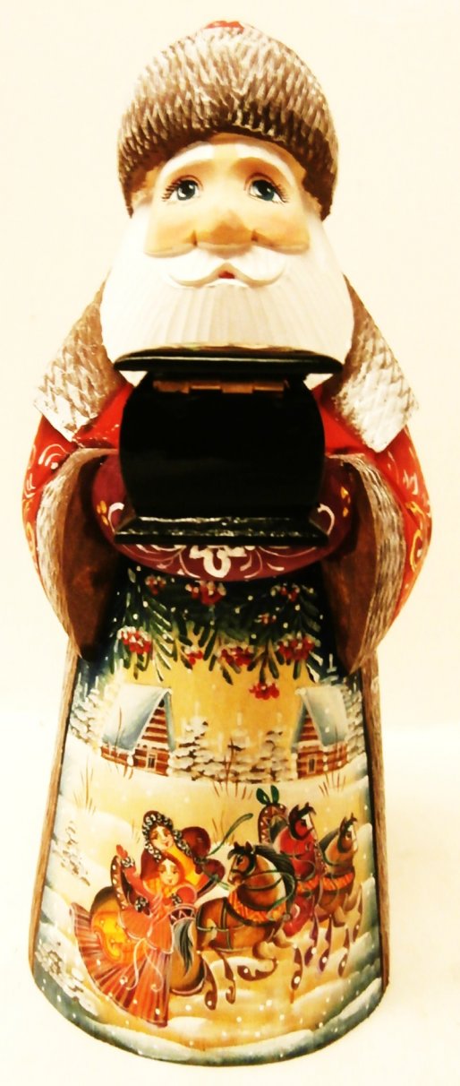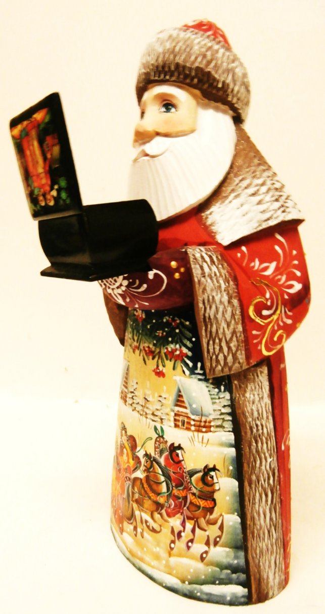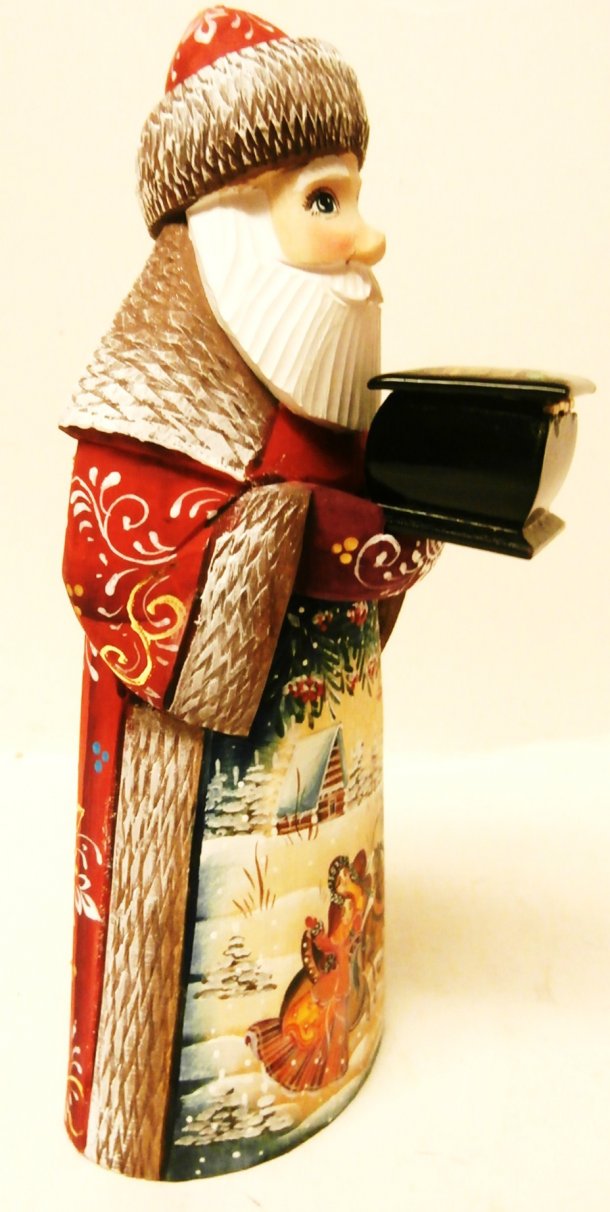 This Santa is crafted by hand: carved out of linden wood and painted with acrylic. Workshop "Skazka", Moscow, Russia.