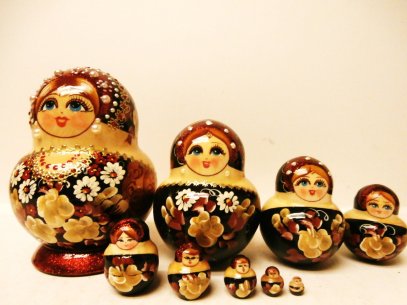 This nesting doll is handcrafted in Russian city of Sergiyev Posad: made from linden wood and painted with acrylic.