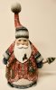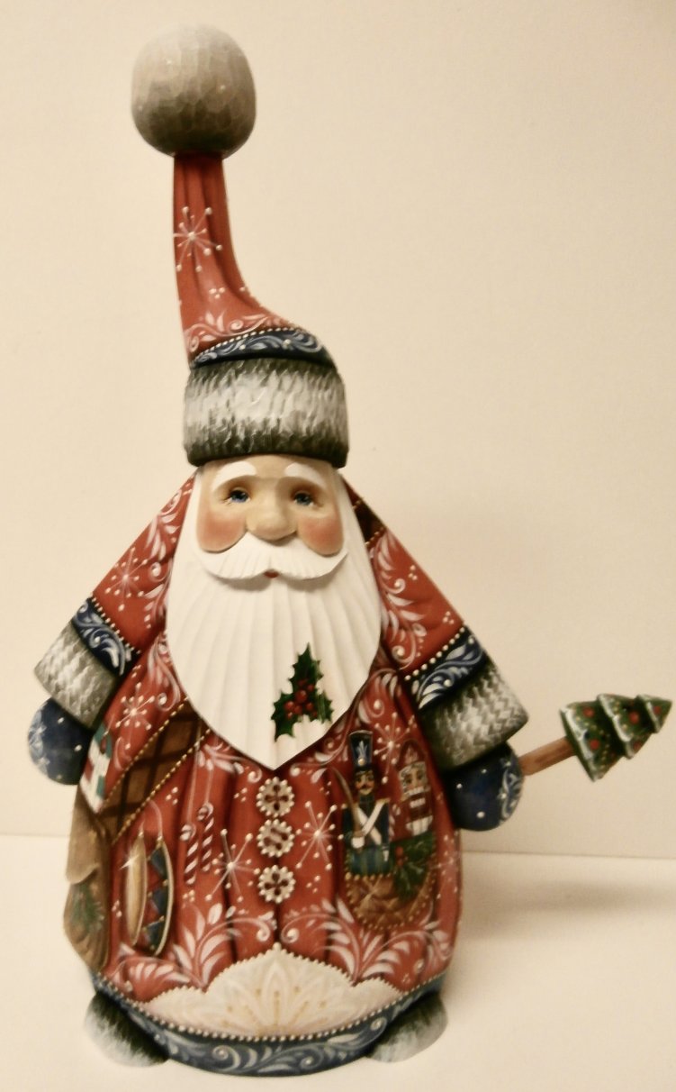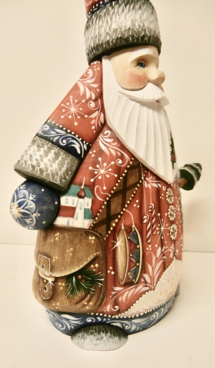 This Santa is crafted by hand: carved out of linden wood and painted with acrylic. It is decorated with nutcracker carved on the front.