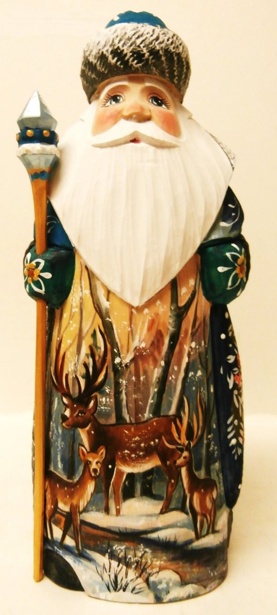 This is a genuine Russian wooden collectible santa carved from linden wood and painted with acrylic paint. Workshop "Shmak", Russia.