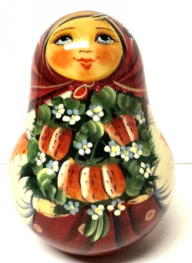 This music doll is crafted by hand in Russia: made out of linden wood and painted with acrylic. The bell is put inside. This doll is intricately painted with scenes of summer life in Russian village. Workshop "Kvitok".
