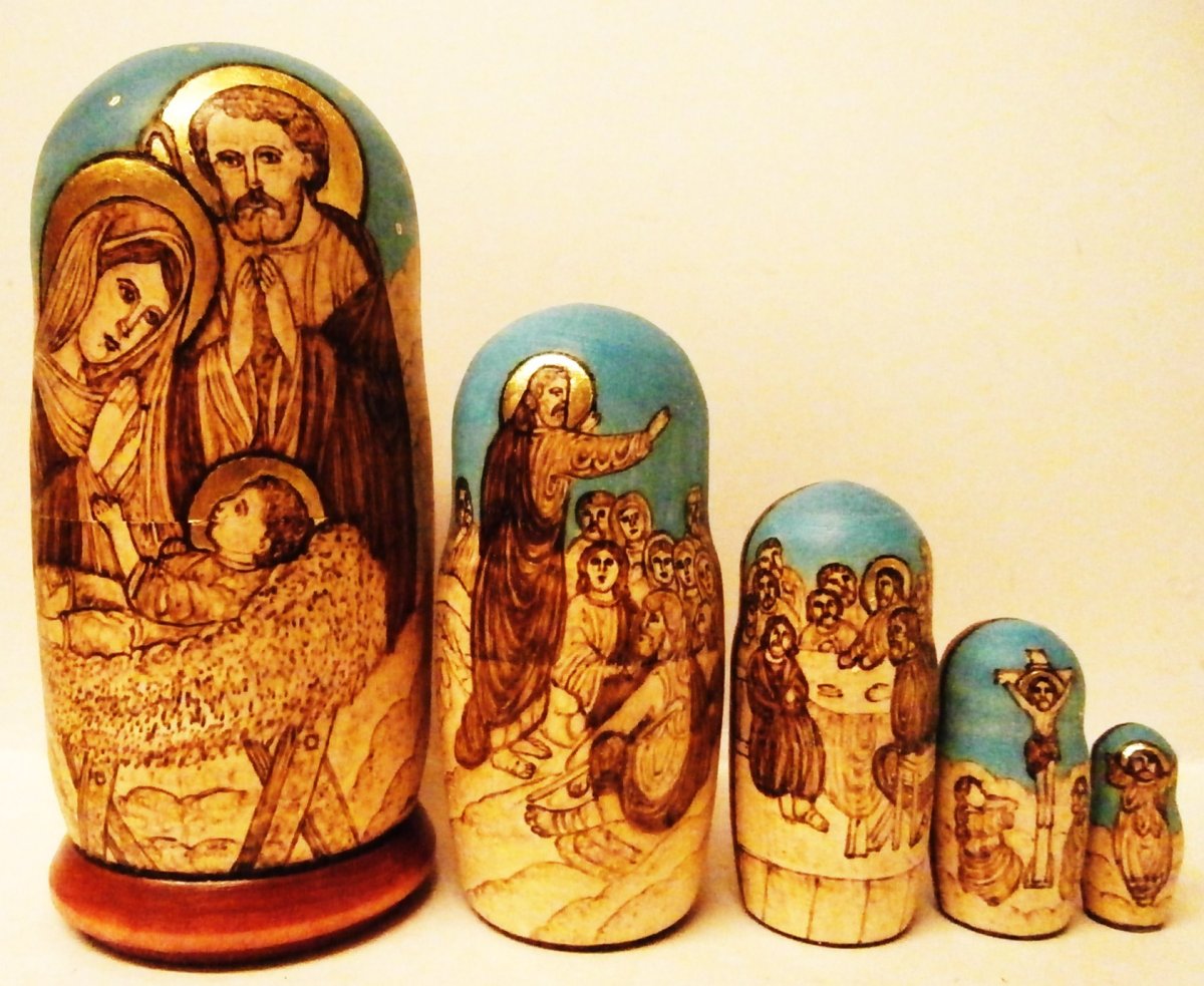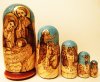This nesting doll is crafted by hand: made out of linden wood and burned on wood on both sides of the doll. It is covered by lacquer. Limited. Workshop "Russkiy Dom", Moscow.