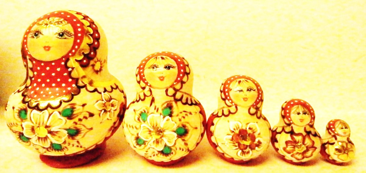 This nesting doll is handcrafted in Moscow, Russia: made out of linden wood and painted with acrylic. Workshop "Russkiy Dom", Moscow, Russia.