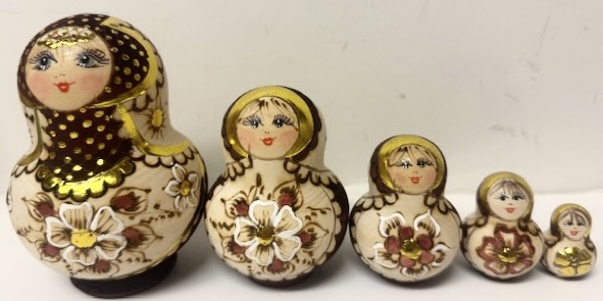This nesting doll is handcrafted in Moscow, Russia: made out of linden wood and painted with acrylic. Workshop "Russkiy Dom", Moscow, Russia.