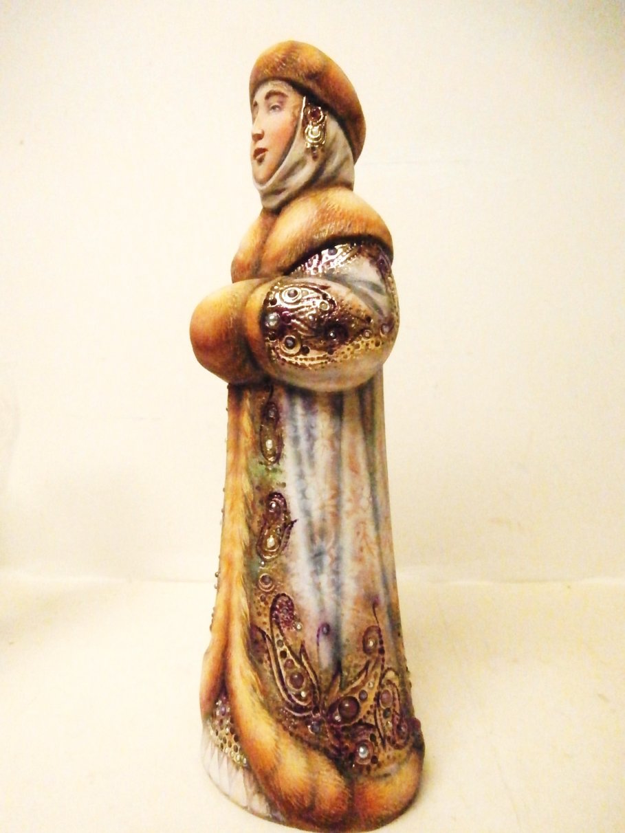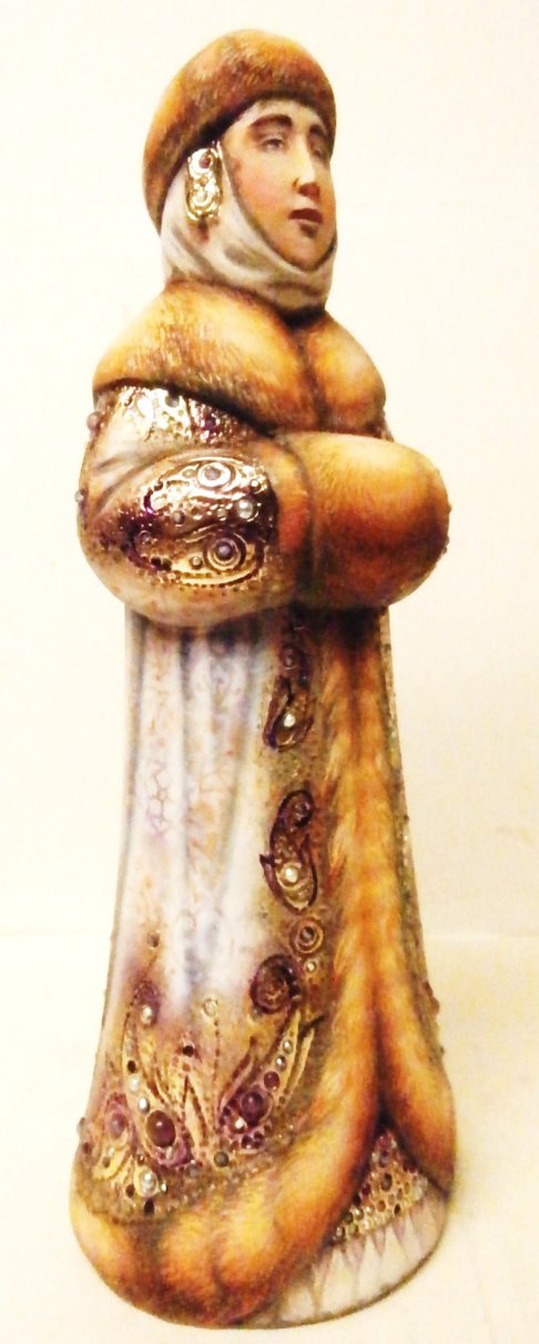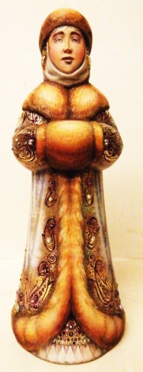 This Russian genuine Snowmaiden is handcrafted in Moscow, Russia: carved out of linden wood and painted with watercolor. It is decorated with authentic gold leaf and more than 150 semiprecious stones. Workshop "Russkiy Dom", Moscow, Russia. Maria Dolgoroukova was the first wife of the First Romanov Tzar Michael (1596-1645), coronated as a Tzar of Russia in 1613.
