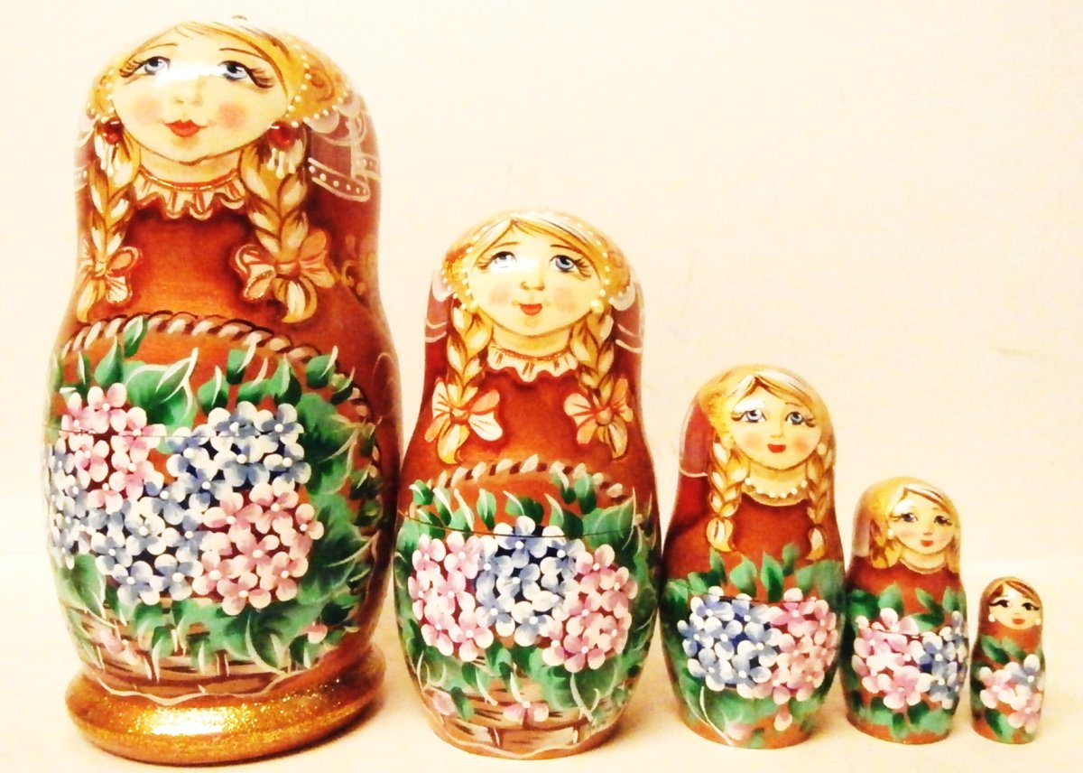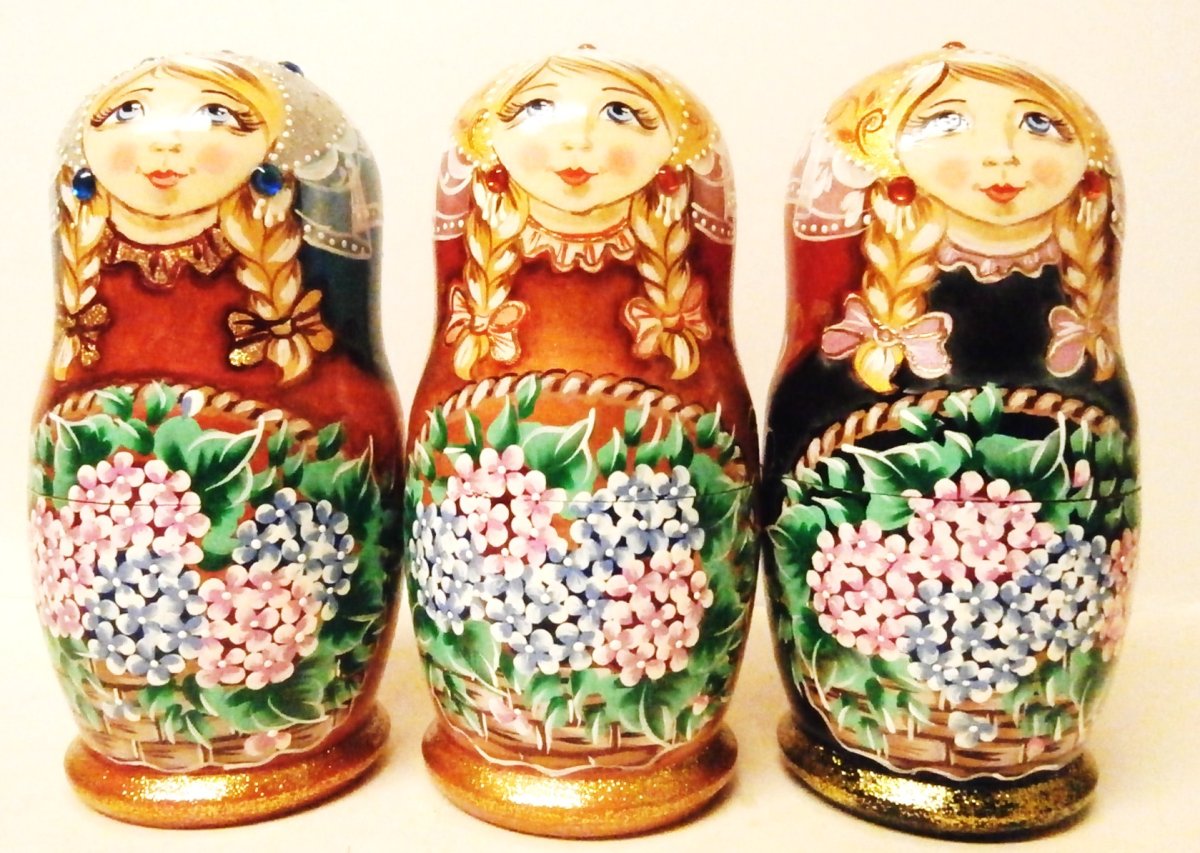This nesting doll is handcrafted in Moscow, Russia: made out of linden wood and painted with acrylic. Workshop "Russkiy Dom", Moscow, Russia. Sells by three units, $27.50 each.