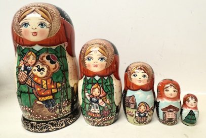 This nesting doll is handcrafted in Russian city of Sergiyev Posad: made from linden wood and painted with acrylic.