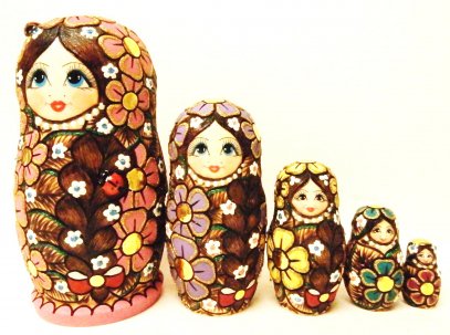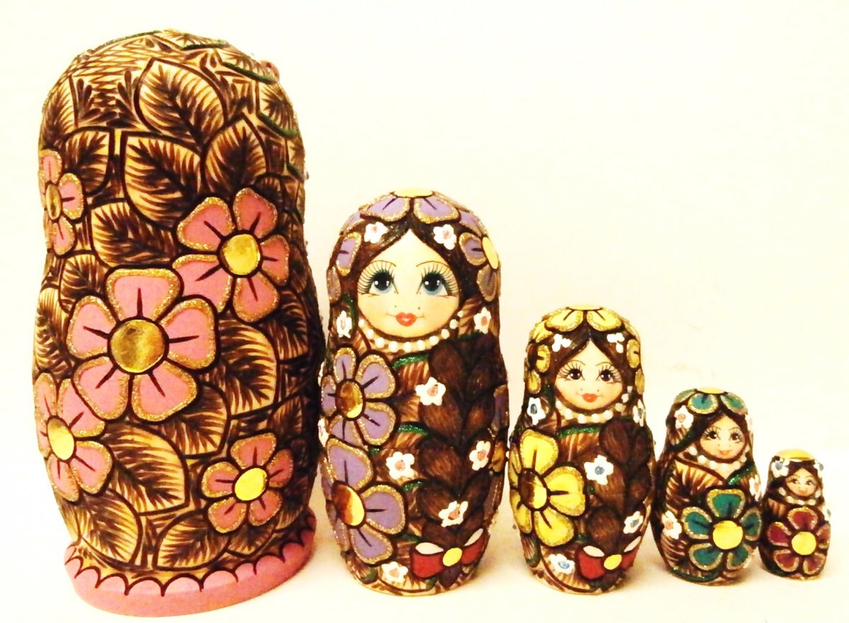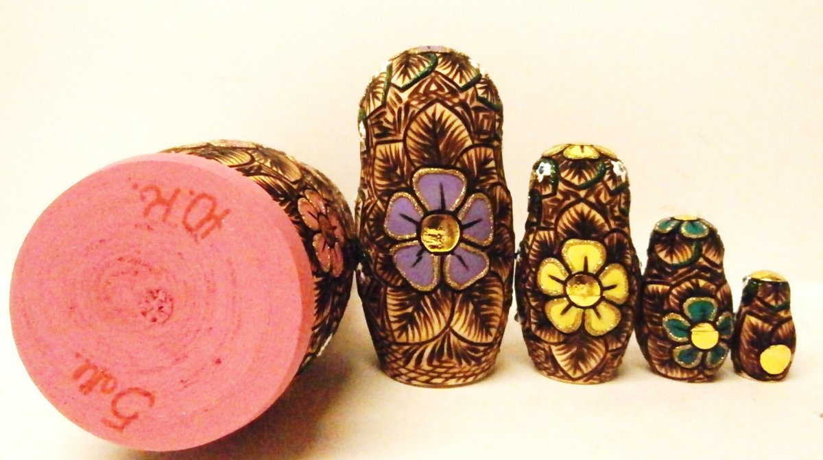 This nesting doll is crafted by hand: made out of linden wood and painted with acrylic. Workshop "Svetlana", Moscow, Russia.