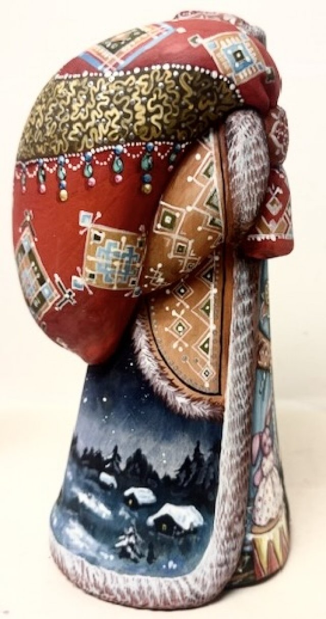This Santa Claus is crafted by hand: intricately carved out of linden wood and meticulously painted with acrylic. Workshop "Russkiy Dom".