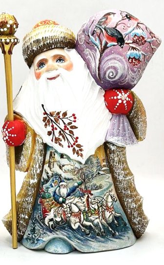 This Russian genuine Santa is handcrafted in Moscow, Russia: carved out of linden wood and painted with acrylic. Workshop "Russkiy Dom", Moscow, Russia.
