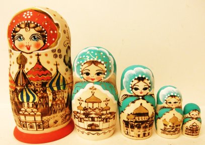 This nesting doll is crafted by hand: made out of linden wood and lacquered. It shows different cathedrals of Mosscow. The technique of pyrography is used to burn on wood the subject matter.