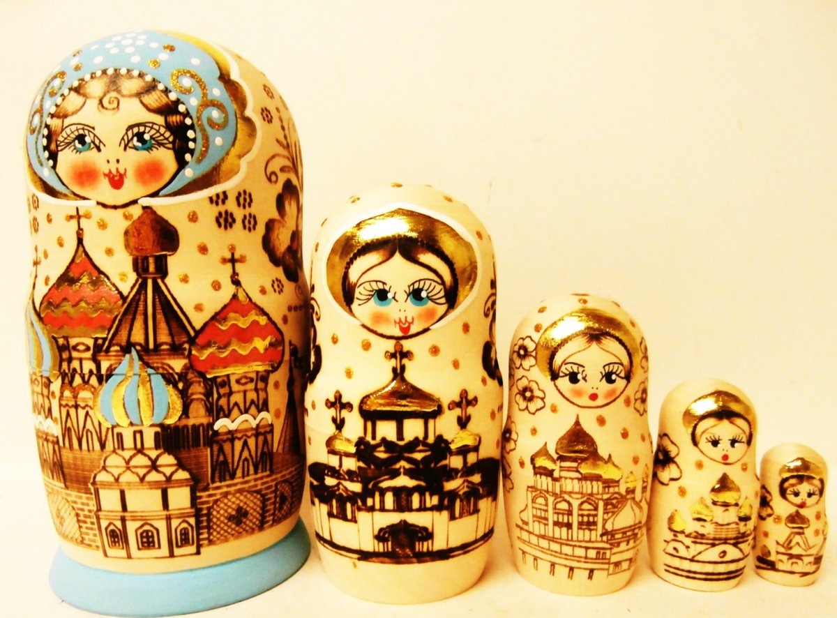 This nesting doll is crafted by hand: made out of linden wood and lacquered. It shows different cathedrals of Mosscow. The technique of pyrography is used to burn on wood the subject matter.