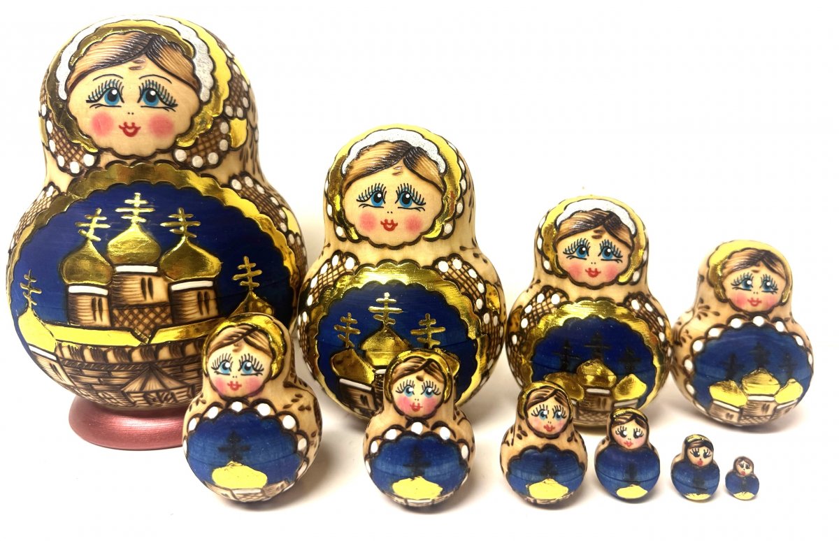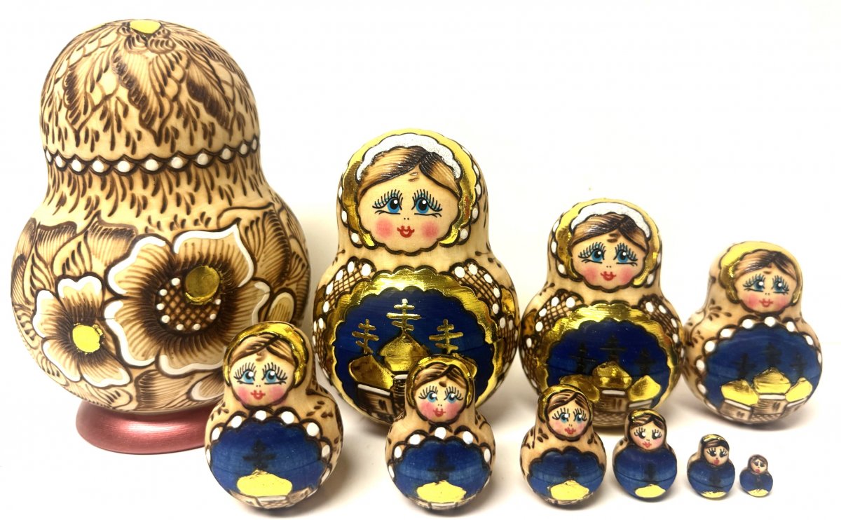 This nesting doll is handcrafted in Moscow, Russia: made out of linden wood and painted with acrylic. Workshop "Russkiy Dom", Moscow, Russia.