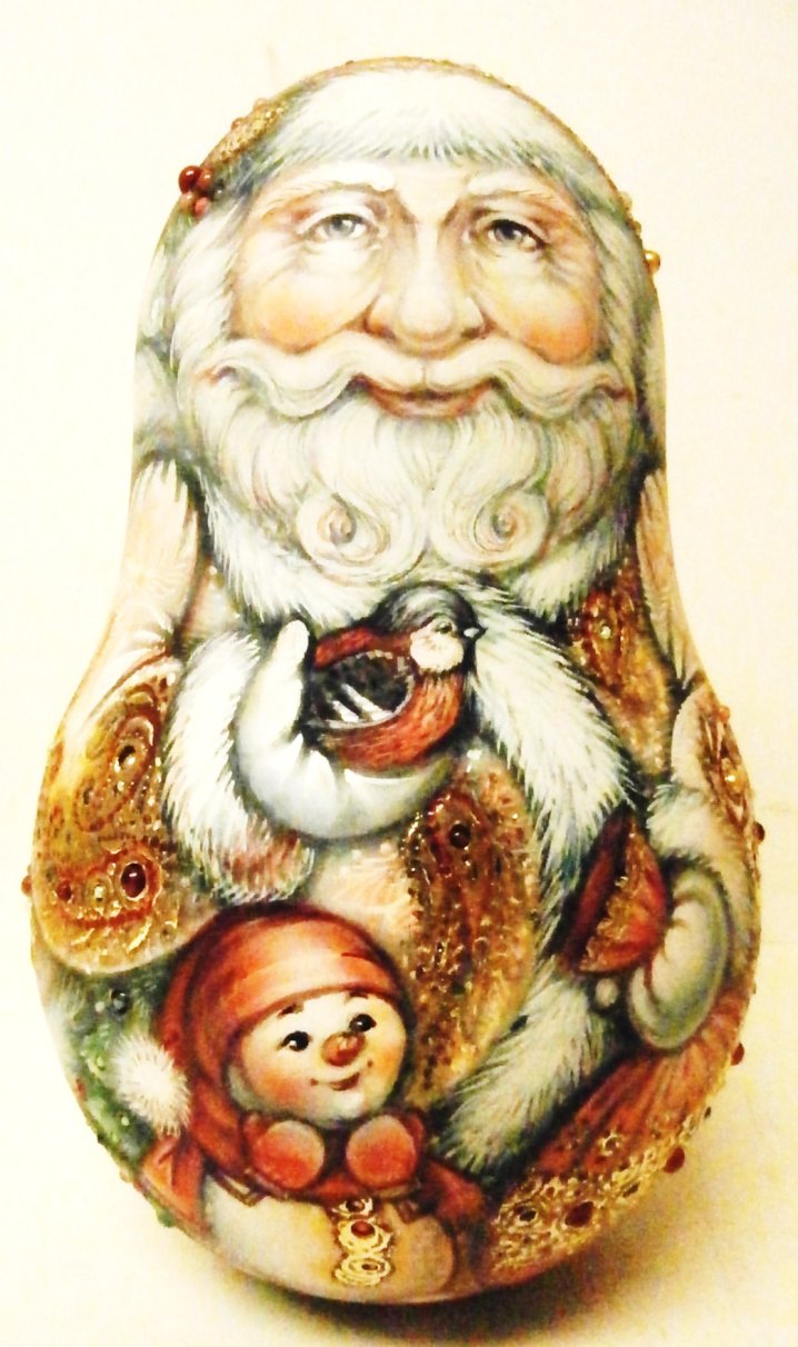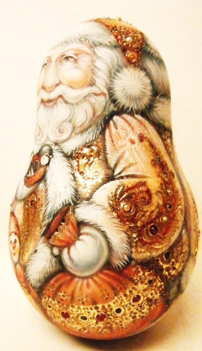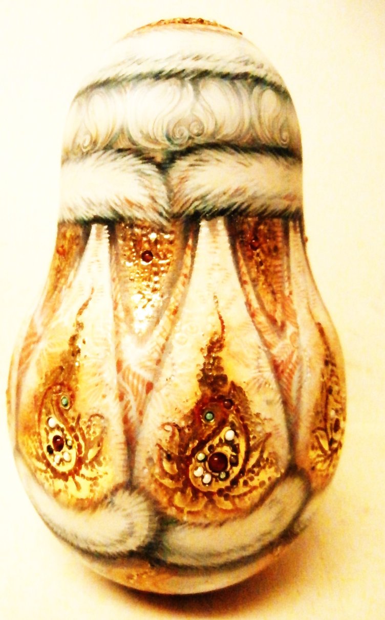 This work is crafted by hand and only once: made out of linden wood and painted with tempera. It is decorated with authentic gold paint and 83 semi precious stones: Garnet - 31, Pearl-16, Ruby-9, Agate-13, Quarz-7, Amethyst-8, Coral-10, Cat's Eye-8, Chrysolite-4, Pearl-77. Mild matte finish colors along with tender white tones make it even more attractive and eye catching.