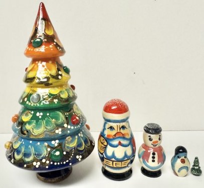 This nesting doll is crafted by hand: made out of linden wood and painted with acrylic. 7"H