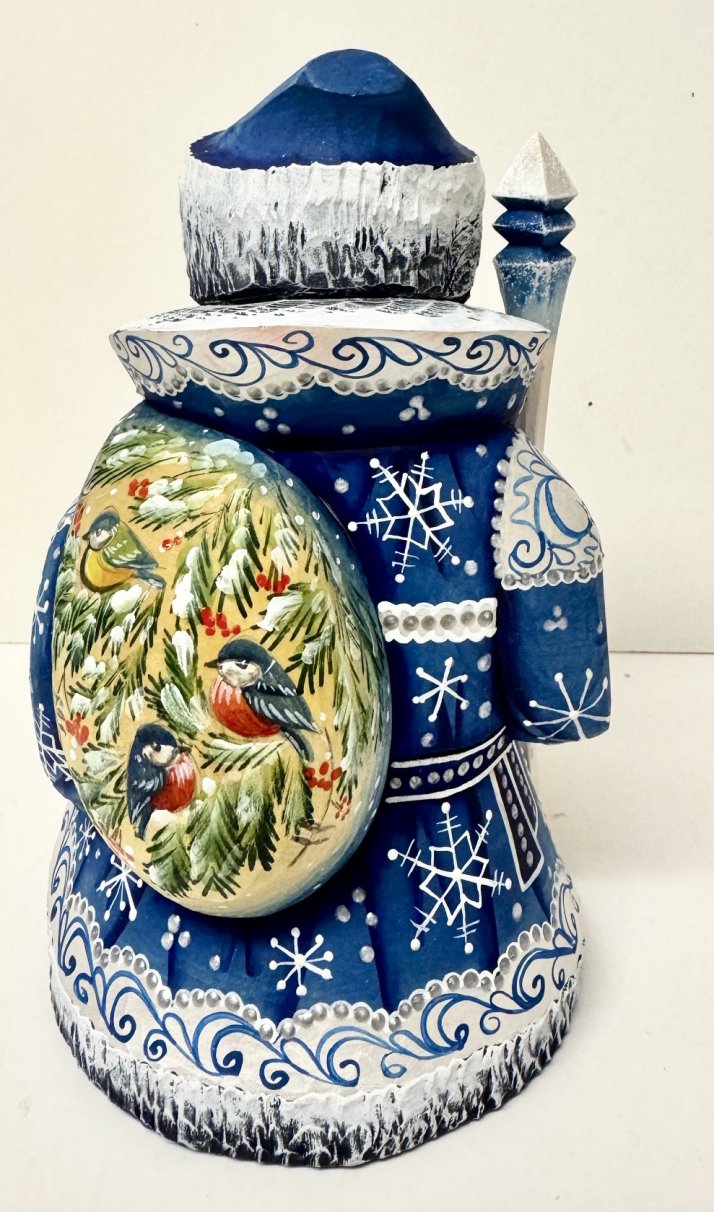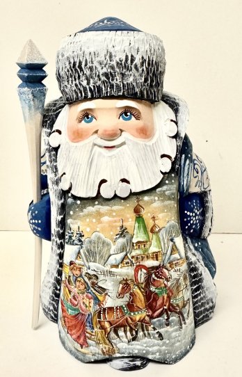 This Russian genuine Santa is handcrafted in Moscow, Russia: carved out of linden wood and painted with acrylic. Workshop "Russkiy Dom", Moscow, Russia.