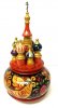 This music box is handcrafted in Moscow, Russia: made out of linden wood and painted with acrylic. It plays the tune "Kalinka". It is painted in "Khokhloma" style.