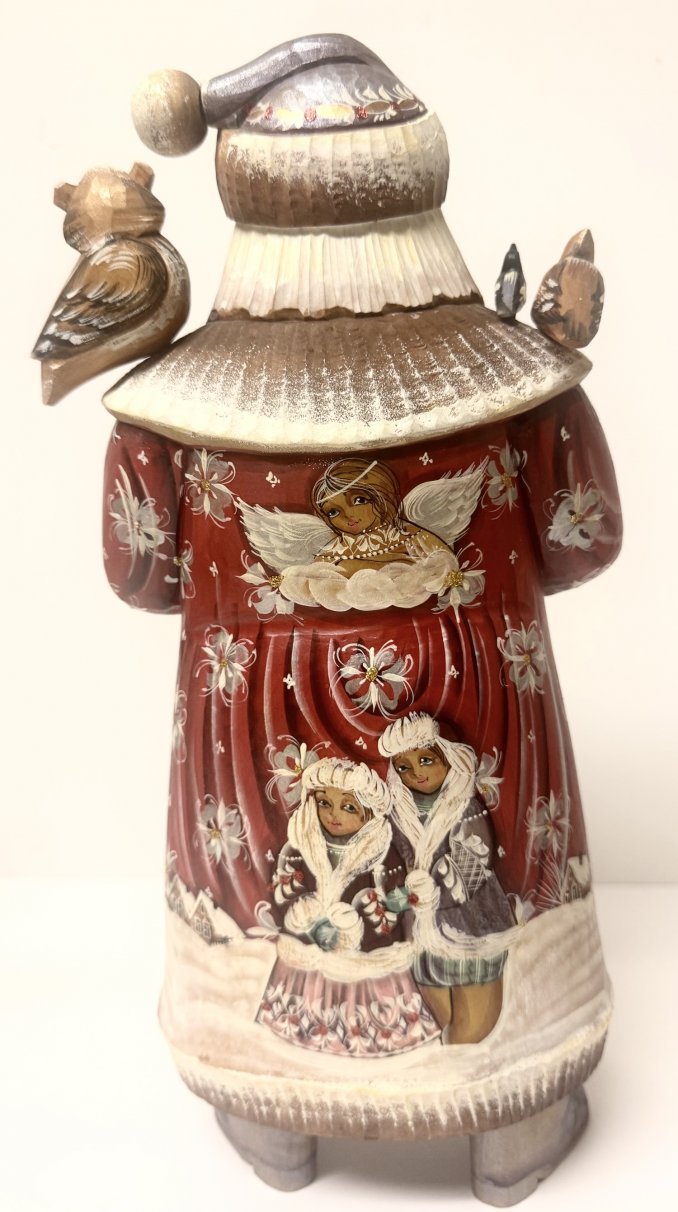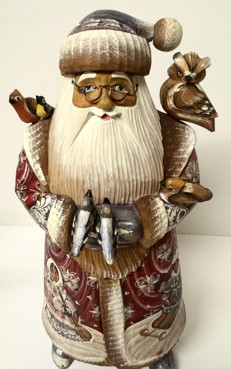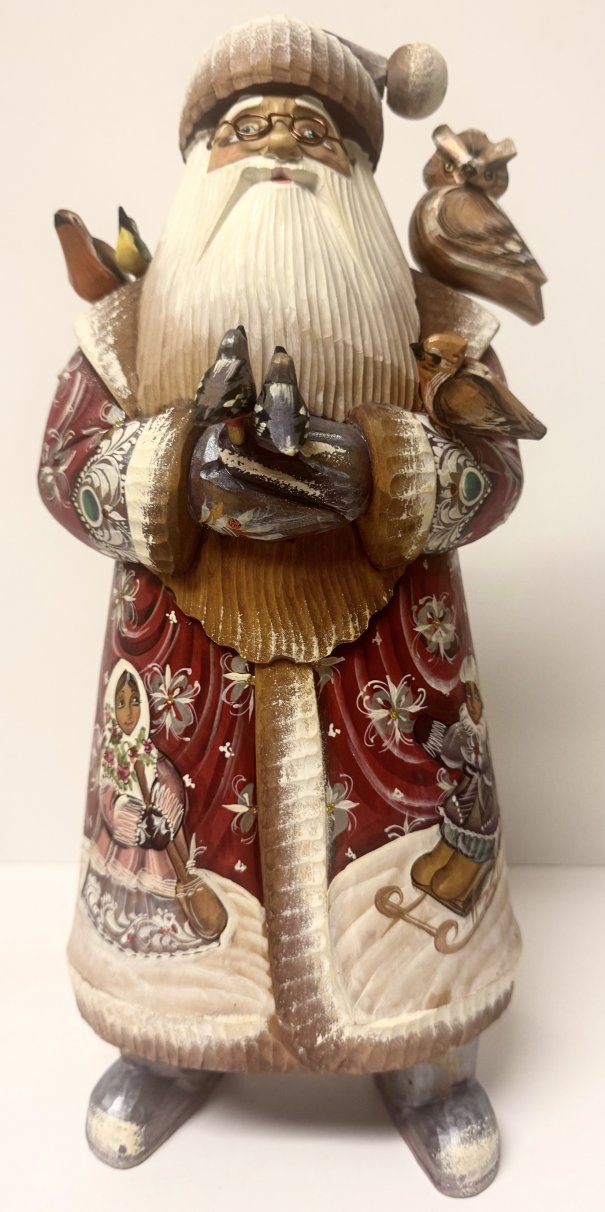 This Santa is crafted by hand: carved out of linden wood and painted with acrylic. 12"H