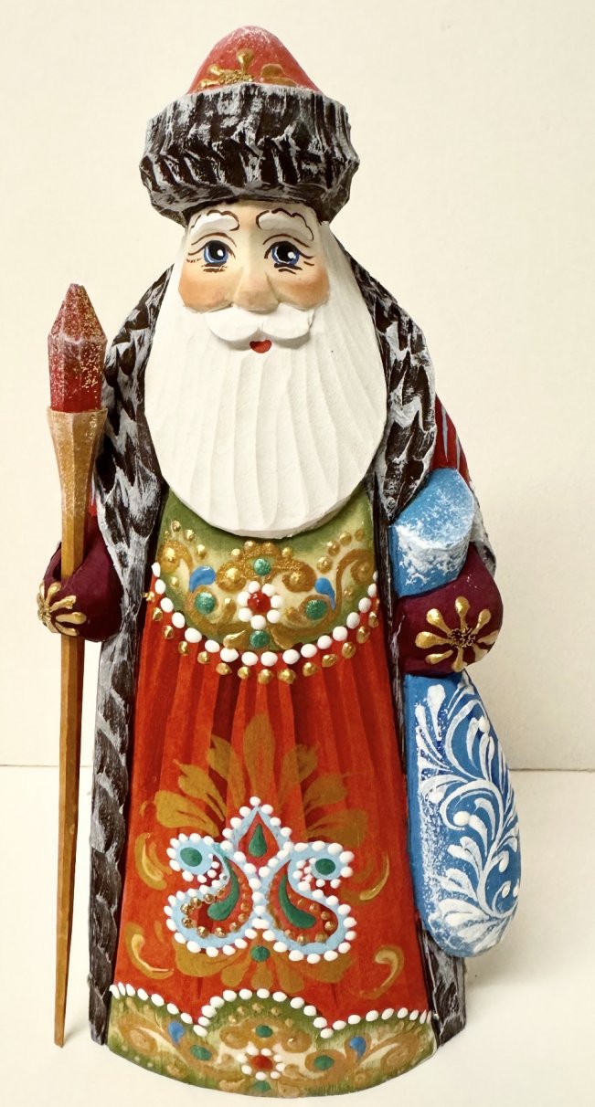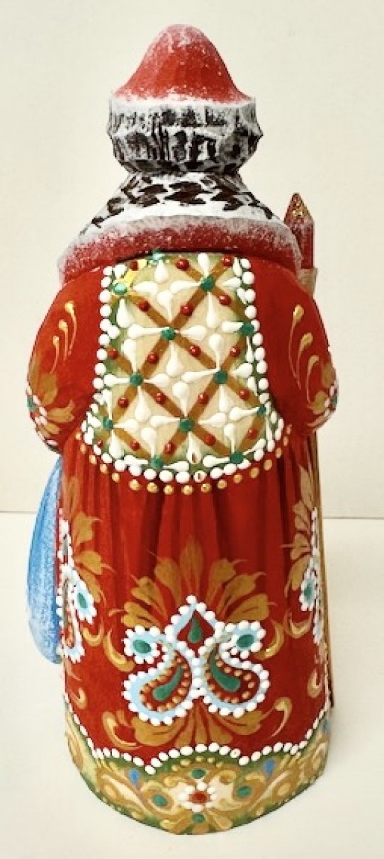 This Russian genuine Santa is handcrafted in Moscow, Russia: carved out of linden wood and painted with acrylic. Workshop "Russkiy Dom", Moscow, Russia.