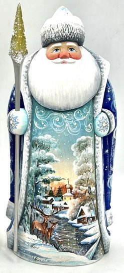This Russian genuine Santa is handcrafted in Moscow, Russia: carved out of linden wood and painted with acrylic. 11-12"H. Workshop "Russkiy Dom", Moscow, Russia.