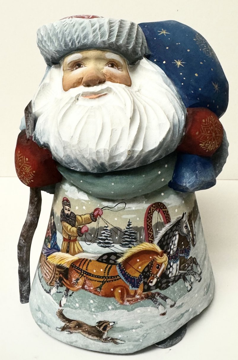 This Santa is crafted by hand: carved out of linden wood and painted with acrylic. 8"H
