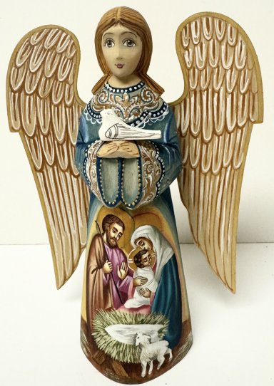 This guardian angel is carved out of linden wood and painted in acrylic.Workshop "Russkiy Dom", Russia.
