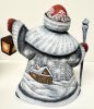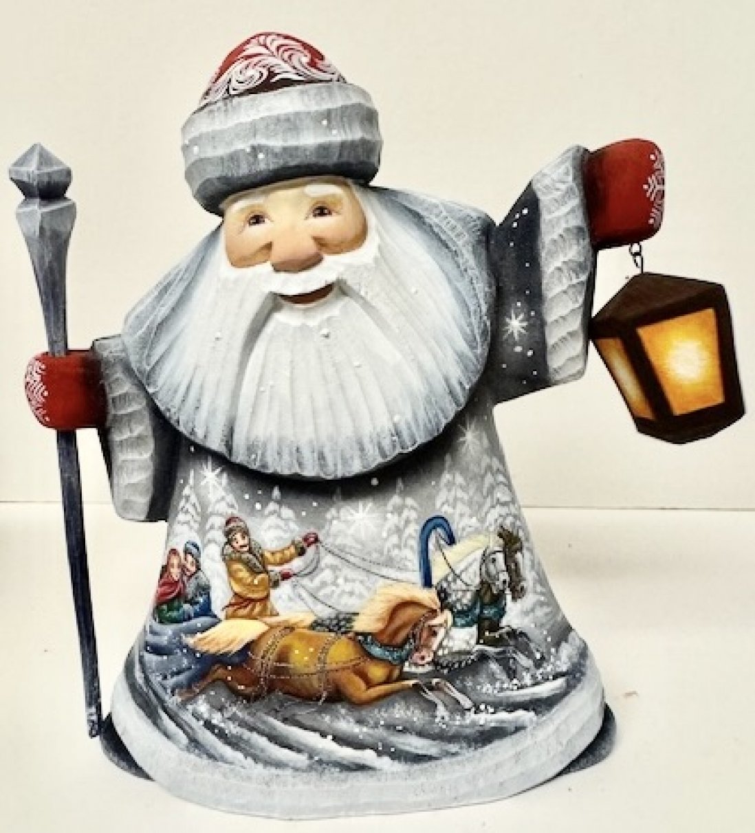 This Santa is crafted by hand: carved out of linden wood and painted with acrylic. It is decorated with magnificent winter scenes all around the carving. Workshop "Russkiy Dom", Moscow, Russia. Limited. 7"H x 5"W x 4"D.