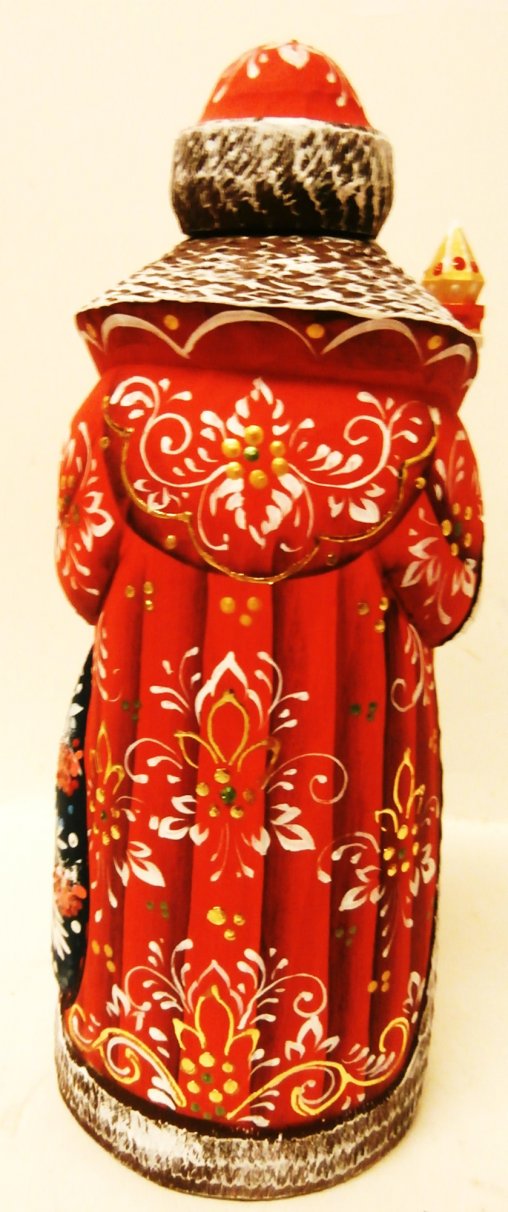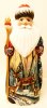 This Santa is handcrafted in Moscow. It is carved out of linden wood and meticulously painted with acrylic. It is decorated with a winter scene.