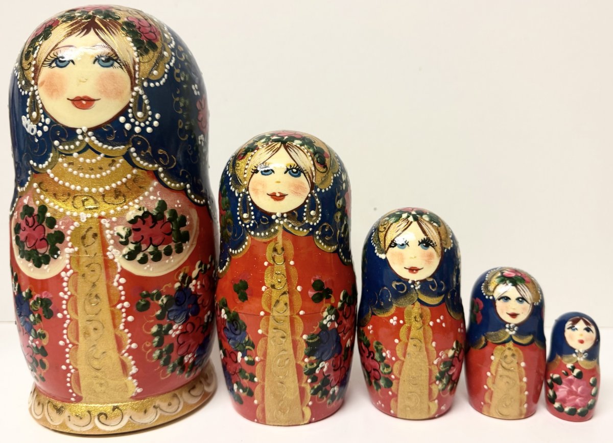 This nesting doll is crafted by hand: made out of linden wood  and painted with acrylic. 7"H.