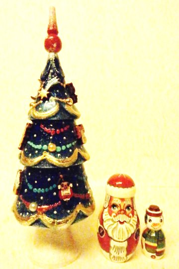 This wooden nesting doll is handcrafted in Moscow, Russia: made out of linden wood and painted with acrylic. Every single Christmas ornament is individually carved and painted and glued to the tree.